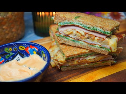 On one of the fried bread slices, add a tablespoon of spicy mayonnaise (optional), then the omelette, ham, mozzarella, and mushrooms.